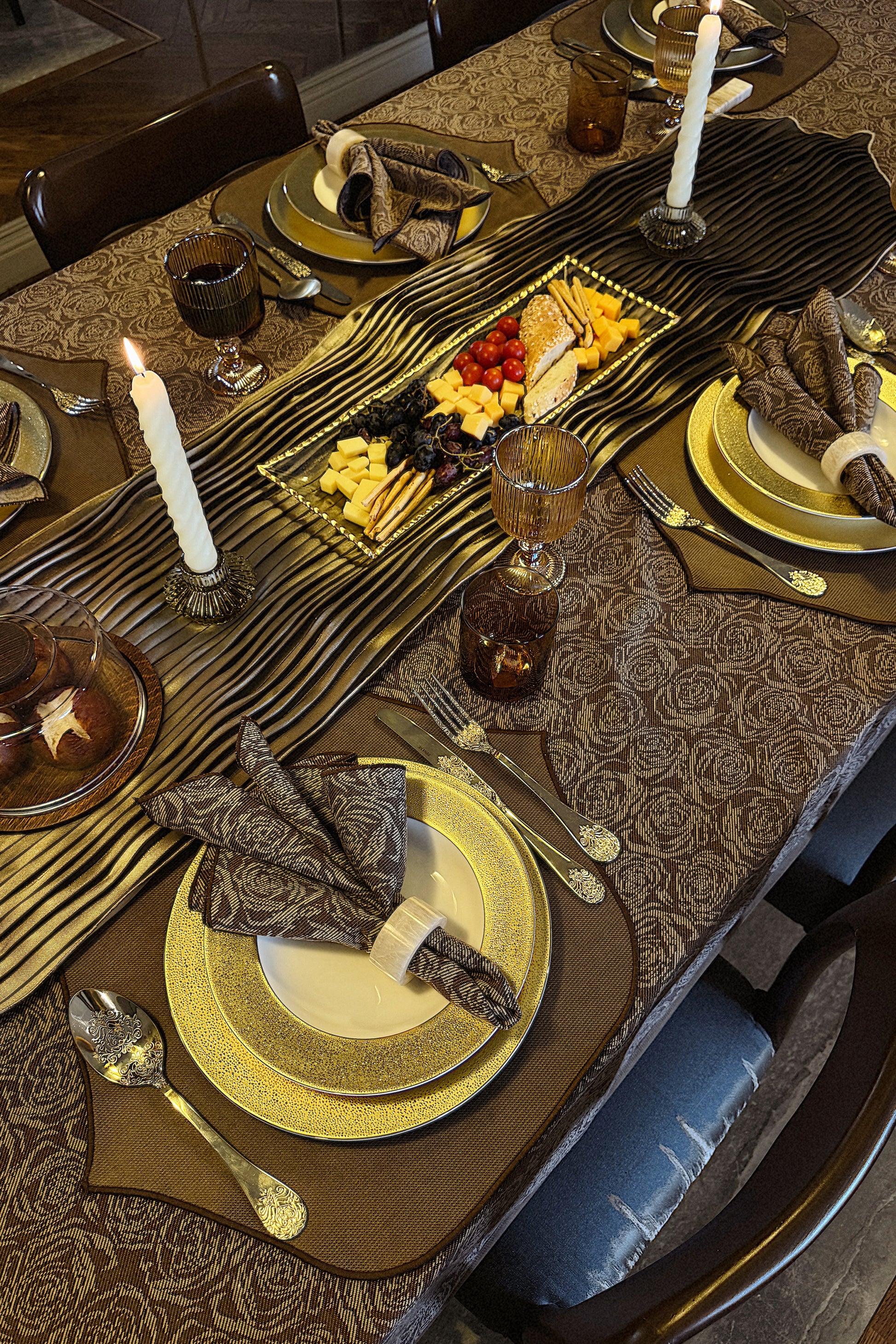 Made from smooth leather, this rounded square place mat features two gracefully arched points, adding subtle structure and elegance to your table. Designed to pair perfectly with the light jacquard tablecloth, it balances bold textures with refined geometry for a modern, luxurious table setting.