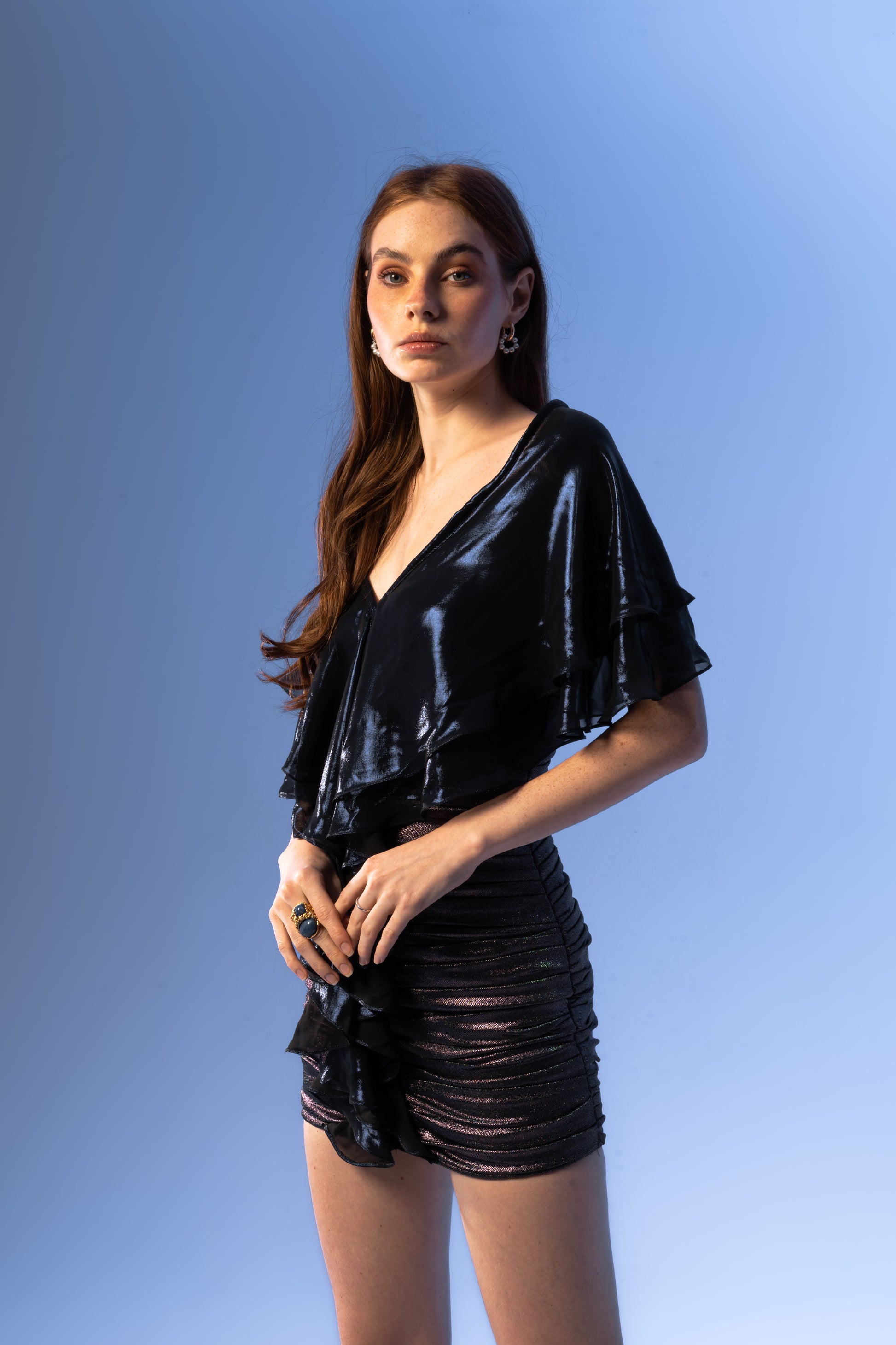 - Over the should Chiffon scarf creating ruffles down the center front