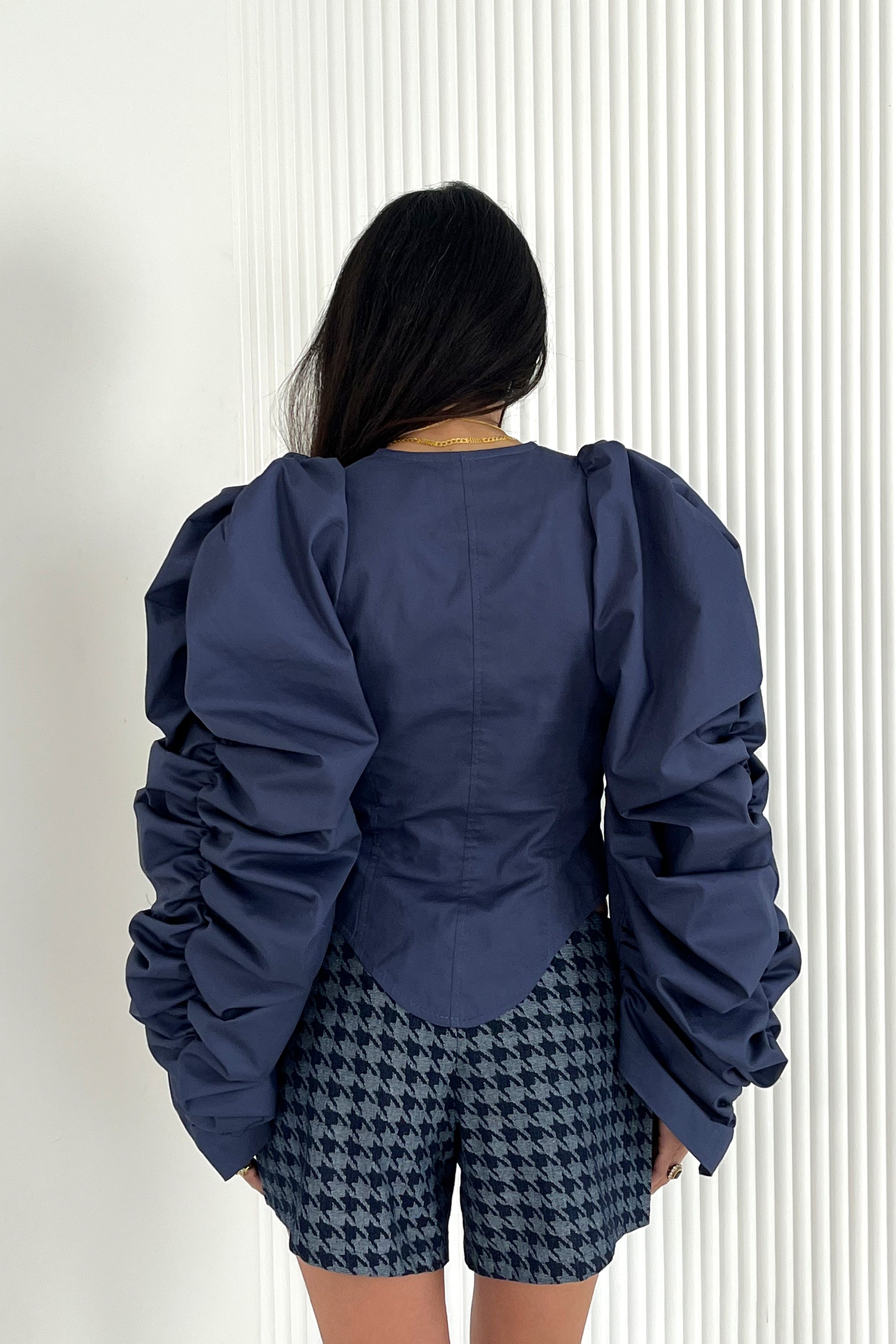 - Bustier silhouette with an exaggerated round sleeve.