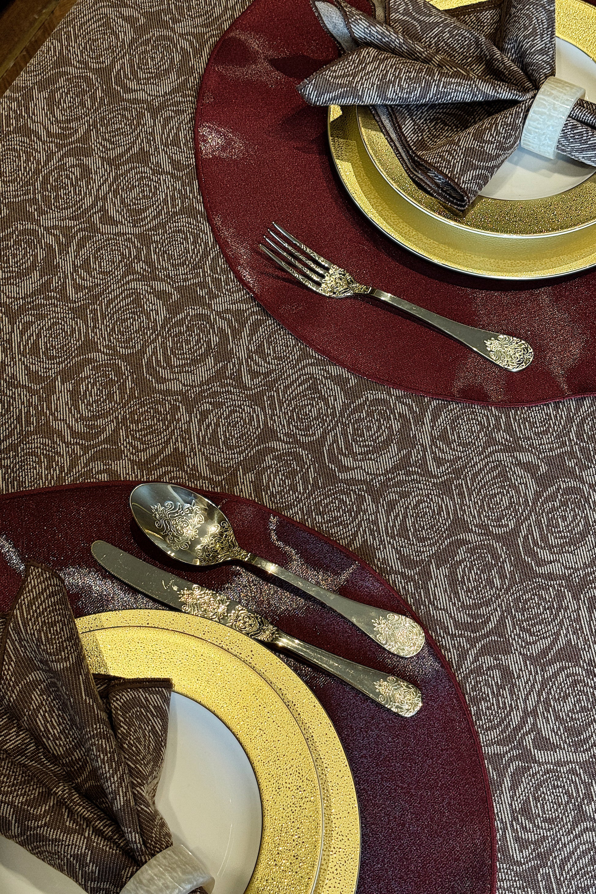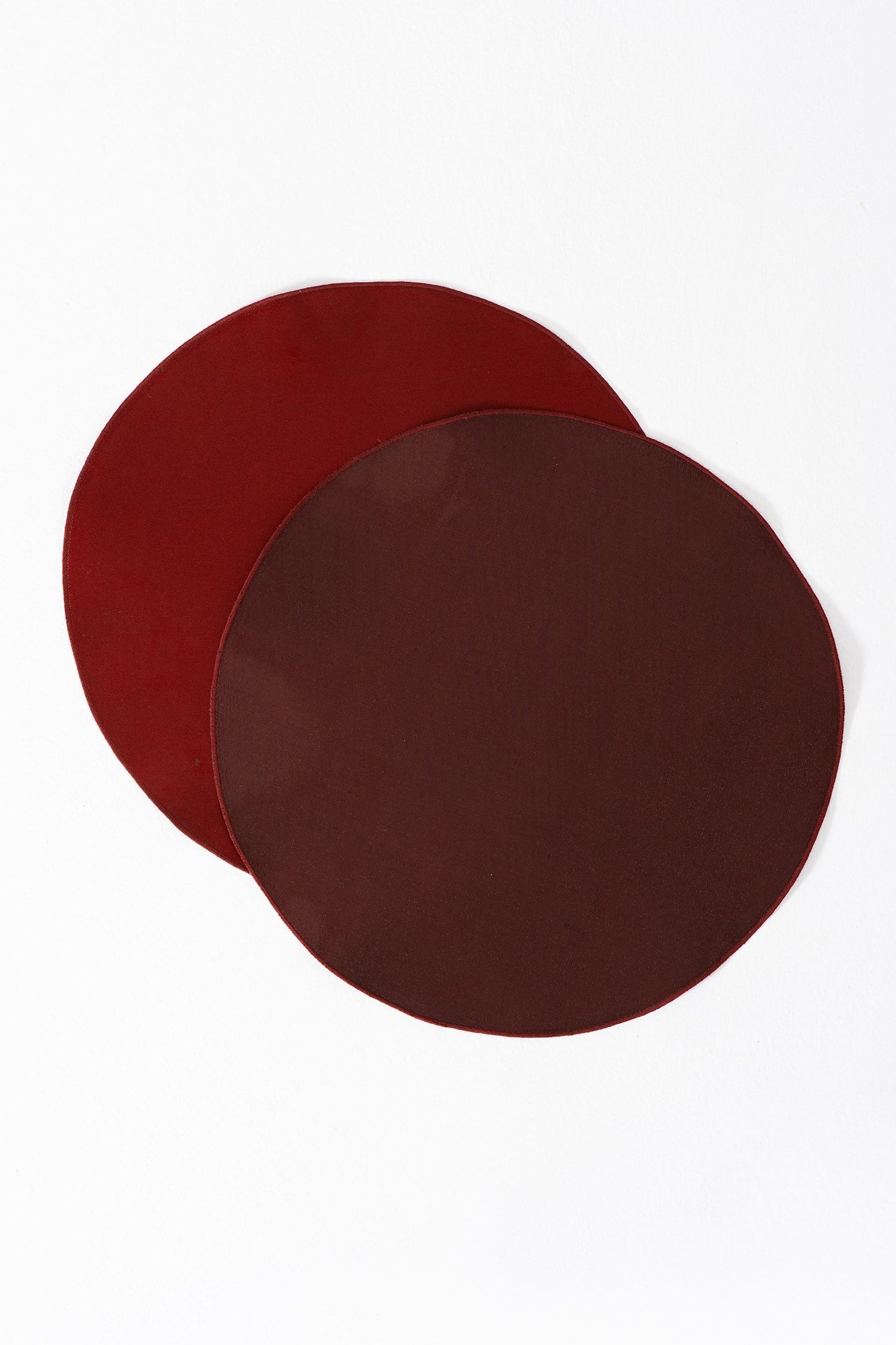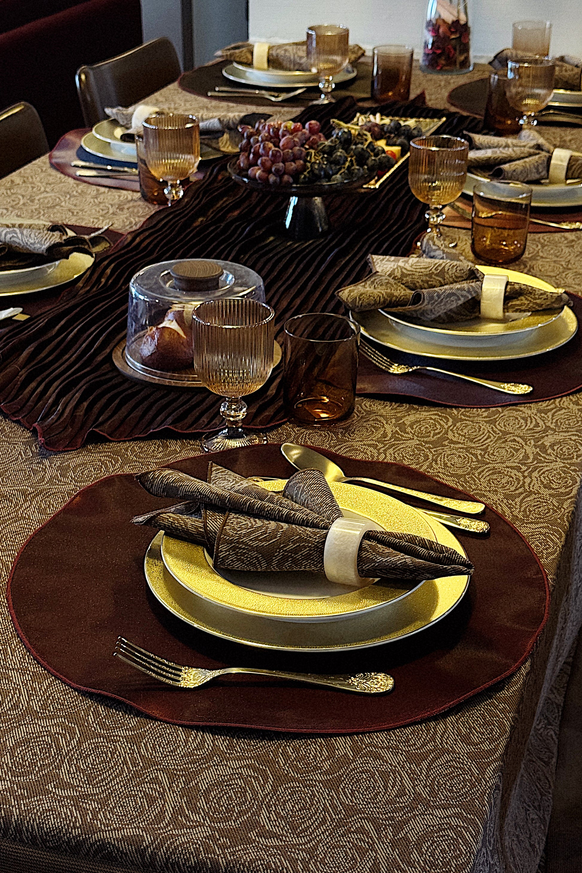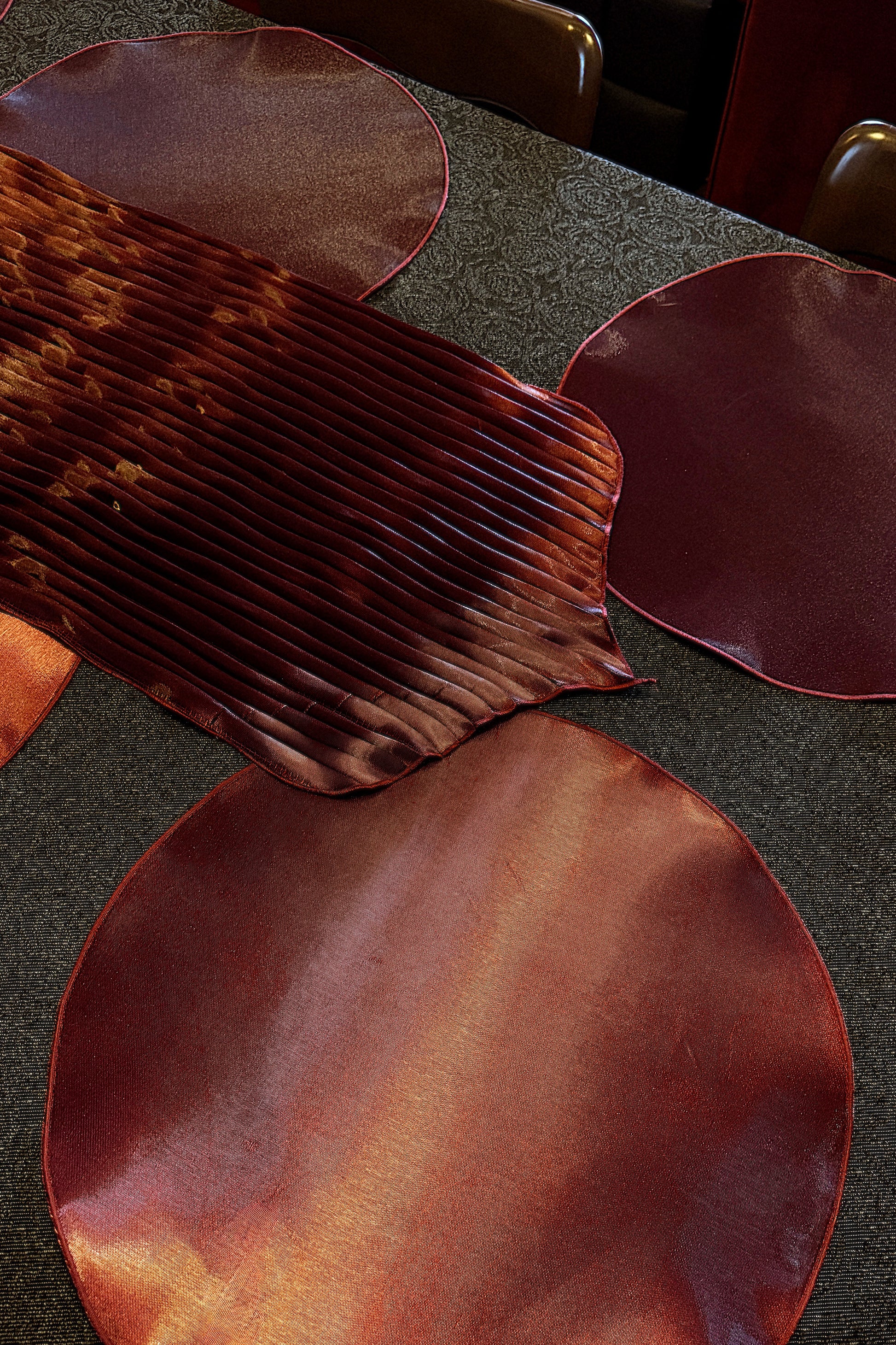 Crafted from luxurious organza, these round tablemats feature a subtle two-tone design with a different shade on each side. Minimalistic and elegant, they let the rich color of the fabric shine while complementing the pleated runners and jacquard tablecloths for a cohesive, striking table setting.